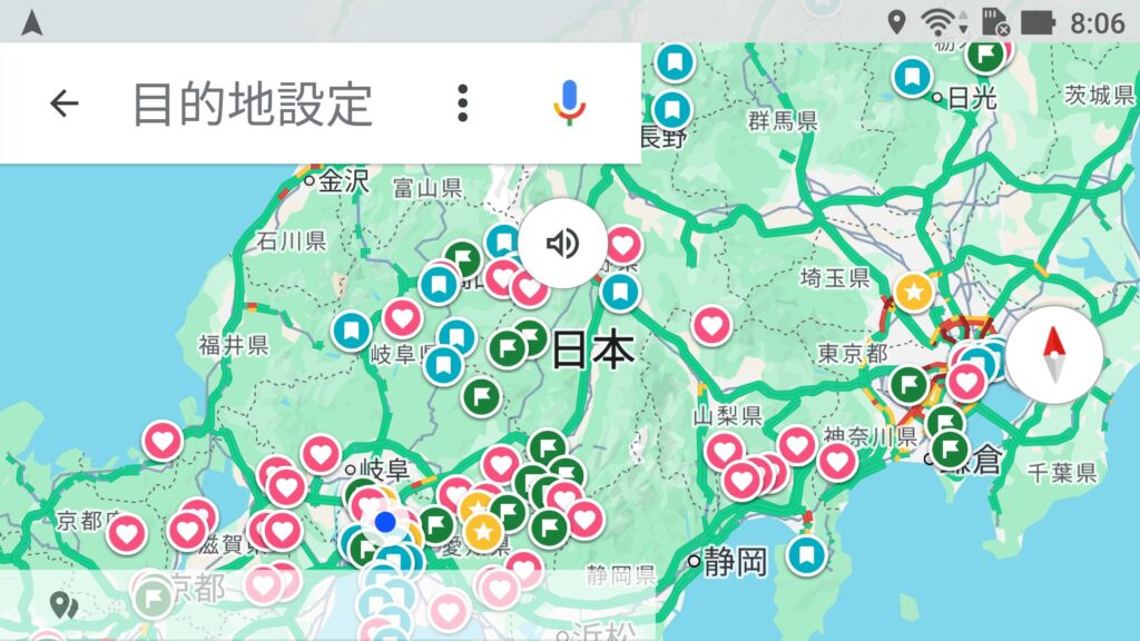 「GoogleのMy Maps」の表示ができます。ツーリングに行きたい時は、事前にMacBookAirでポイントやルートを作成してGoogle Driveに保存しておくと、いつでも切り替えて見えるので便利です!