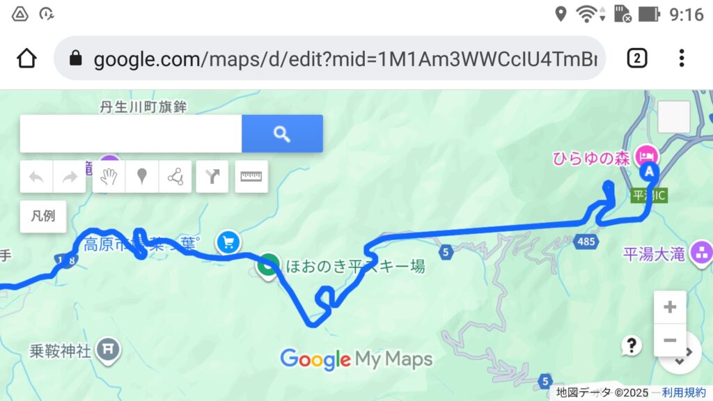 というように、防水でないことと、YouTubeが見れないことは悲しいポイントですが、1,000円で5.5インチの軽量でビジュアルが良いで、ゴツゴツしていないナビを搭載できるなんで幸せなポイントが優っています! またGPSのロガーなども入れておけば、記録しておいてGoogle Drive経由で自宅のMacBookAirでMyMapsにインポートすれば、ツーリングで走ったあの知らない道を振り返ろうとか、ブログに行路を埋め込もうなんてこともストレスフリー(サクサクのためイライラなし)で、シームレス(データは全てクラウド経由で連携)ができるので使いやすさ抜群です。